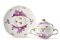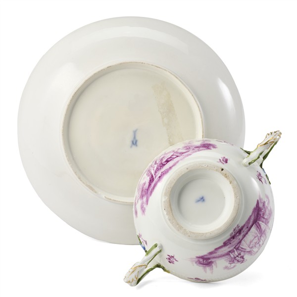 Manifattura di Meissen, 1750 circa. Tazza da puerpera biansata con coperchio e piatto in porcellana decorata da scene galanti e piccoli fiori sparsi in monocromia porpora, profili dorati, fasce del piatto e della tazza a rilievo a finto vimini, pomolo a forma di fiore, anse con rami e fiori a rilievo policromi (tazza h cm 11; piatto d cm 18) (difetti)