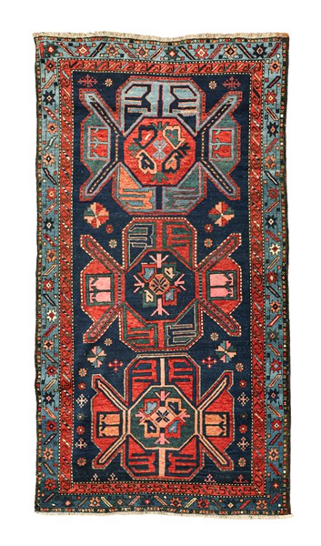 Tappeto Kazak, Caucaso, inizio secolo XX. Decoro con tre medaglioni policromi su fondo blu a guisa di farfalla. Bordura a meandro su fondo azzurro (cm 245x132) (difetti)