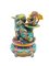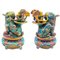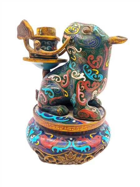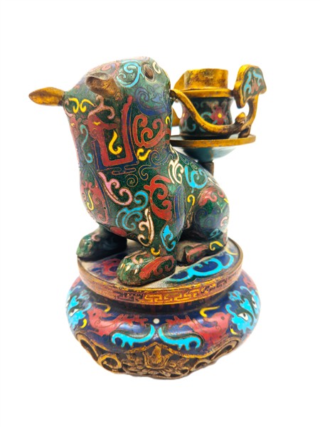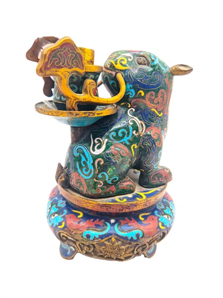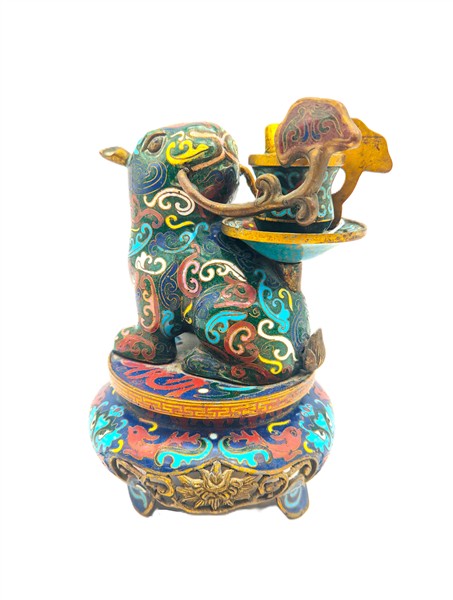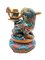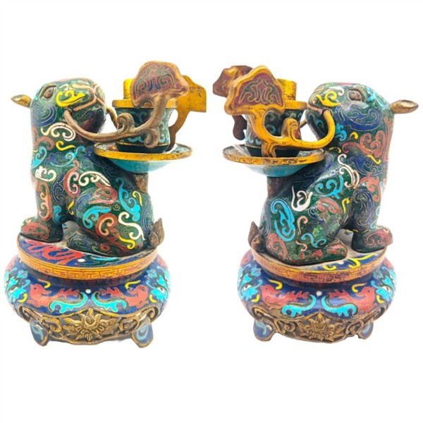 Coppia di candelieri in metallo con smalti cloisonné, fusti in forma di leone buddista portacandela