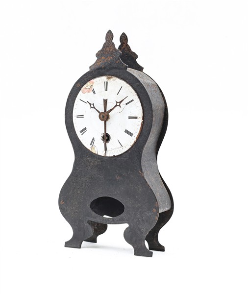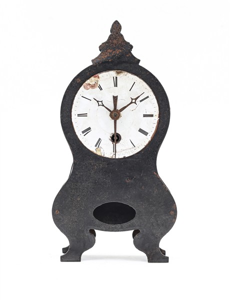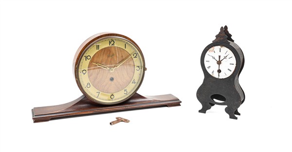 Lotto composto da un orologio da tavolo con cassa in legno anni '30 marcato Kienzle (cm 20,5x38) ed una pendoletta con cassa in ferro (h. cm 23) (difetti e restauri)