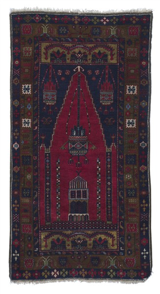 Tappeto preghiera Mudjiur, Anatolia, secolo XX. Mirab a fondo rosso con lampada votiva, architettura e colonne. Nel cartiglio sottostante a fondo verde acido ci sono dei motivi araldici nei toni del blu, rosso e bianco. Bordura a fondo tabacco con motivi floreali stilizzati (cm 214x113) (difetti)