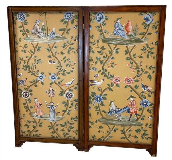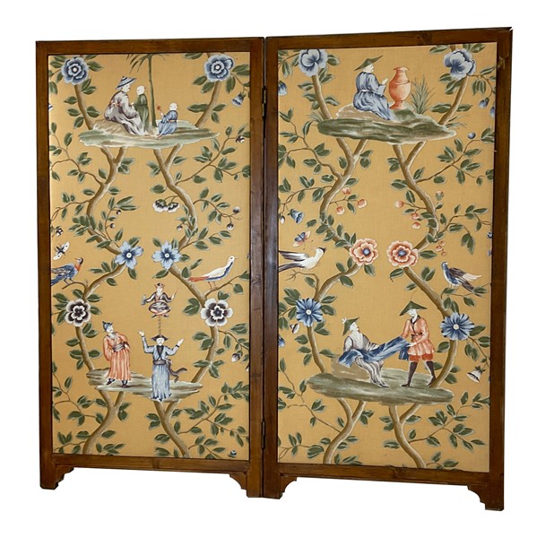 Paravento a due ante con cornice in legno e pannellature in tessuto policromo decorato a chinoiserie. Secolo XX (cm aperto 128x128) (difetti e mancanze)