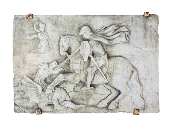 Bassorilievo in pietra scolpita raffigurante San Giorgio e il drago