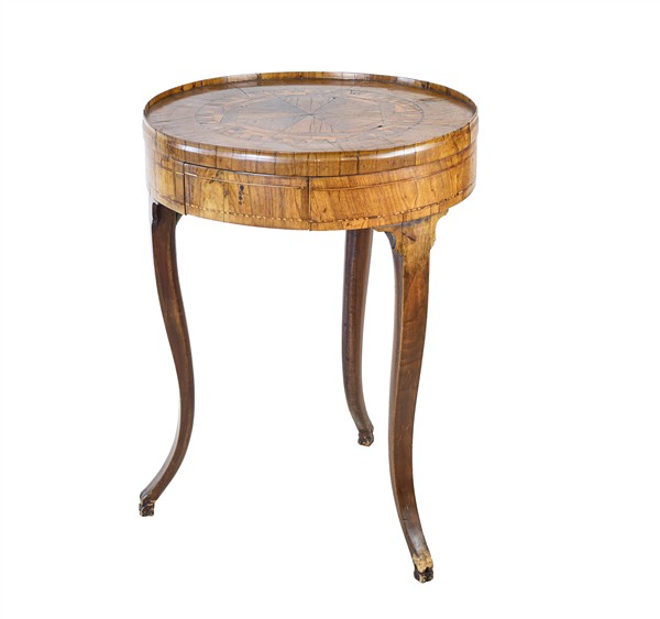 *Tavolino di forma circolare lastronato e intarsiato a motivo geometrico in legni vari, un cassetto nella fascia e tre gambe mosse (d cm 54, h cm 73) (difetti e mancanze)