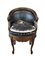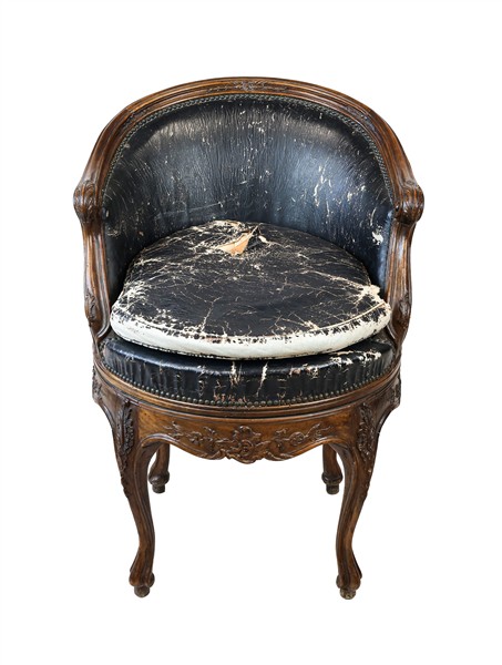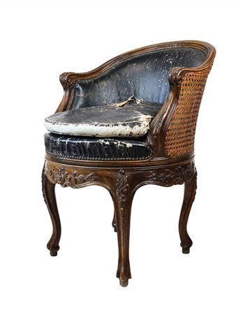 Antica poltroncina girevole a pozzetto di forma mossa in noce intagliato, seduta con cuscino e schienale in cuoio nero borchiato e incannucciato nella parte posteriore (difetti, restauri e piccole mancanze)