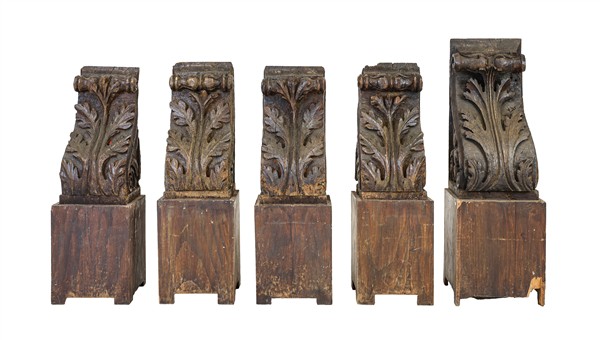 Lotto composto da sette fregi da trave in legno intagliato a voluta fogliacea d