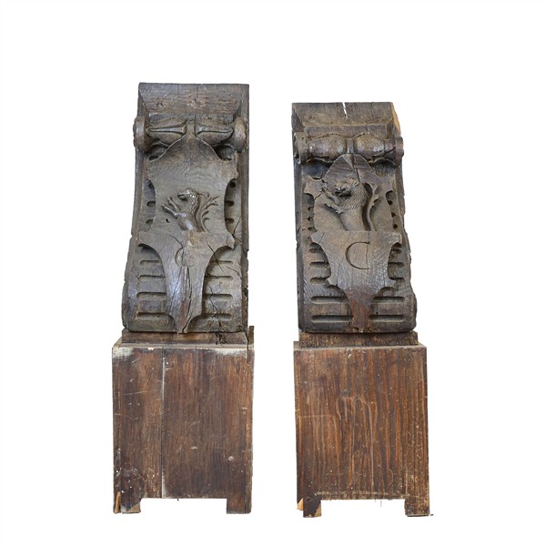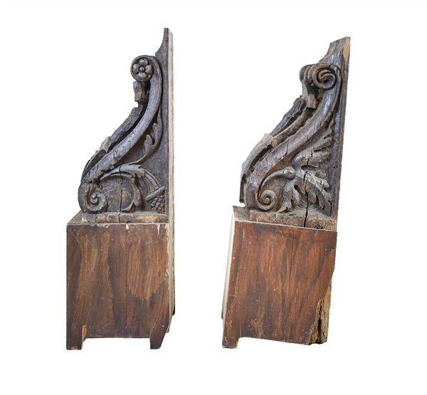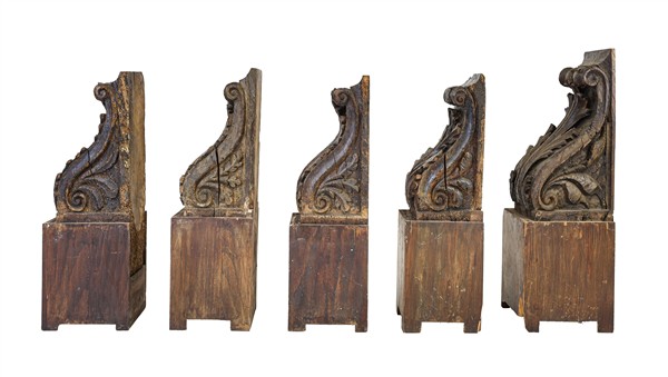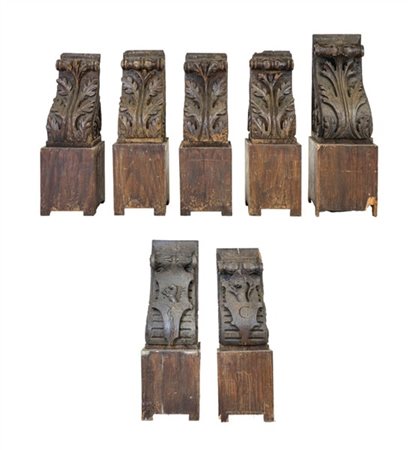 Lotto composto da sette fregi da trave in legno intagliato a voluta fogliacea dei quali due con stemma araldico entro scudo. Secolo XVII-XVIII. Basi squadrate adattate in epoca successiva (h max cm 92) (difetti)