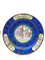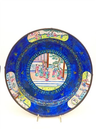 Piatto in rame smaltato e dipinto in policromia con cavetto decorato da figure orientali in un palazzo entro medaglione circolare, falda a fondo blu con decori vegetali policromi e dorature, ai lati tre cartigli con figure entro paesaggi