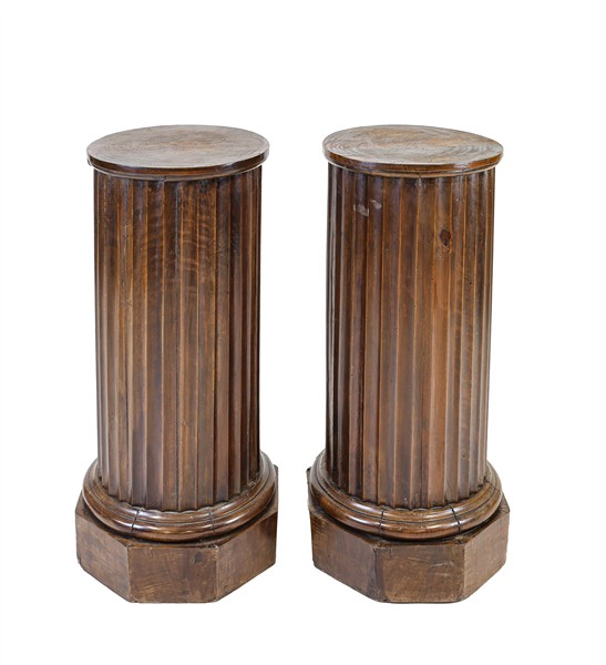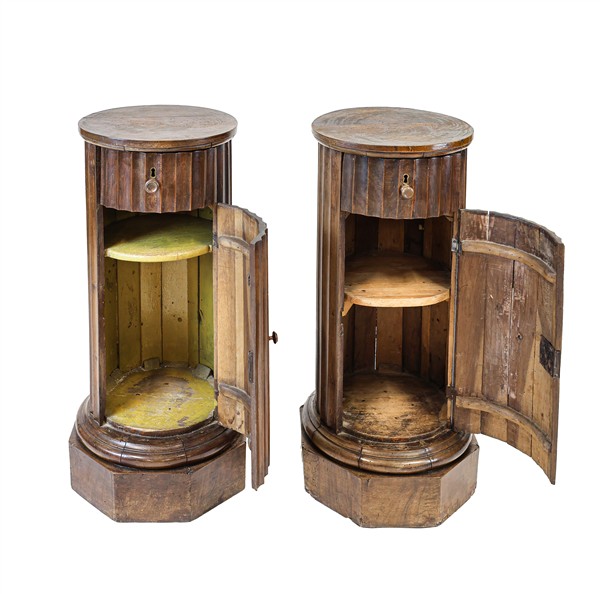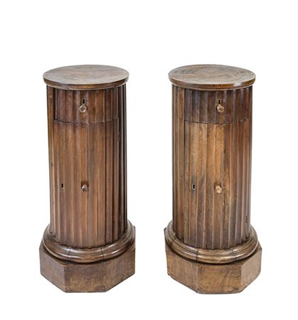 Coppia di mobiletti a colonna scanalata in noce, fronte ad un'anta ed un cassetto, base ottagonale. Secolo XIX (d cm 38, h 86) (difetti)