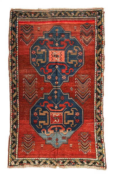 Tappeto Kazak, Chonsoresk, fine secolo XIX-inizio secolo XX. Decoro con due medaglioni polilobati a fondo blu con all'interno i motivi a nuvola tipici della provenienza. Campo color rosso scuro cosparso di Alberi della Vita (cm 246x154) (difetti, rapature e vecchi restauri)