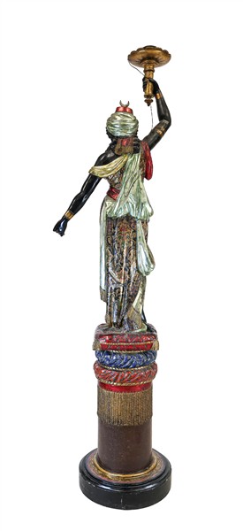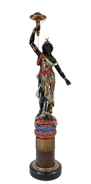 Figura di mora reggitorcia in legno intagliato e stucco dipinto in policromia e dorato, poggiante su semicolonna con finto tessuto. Elettrificata in epoca posteriore (h tot cm 235) (difetti, restauri e mancanze)
