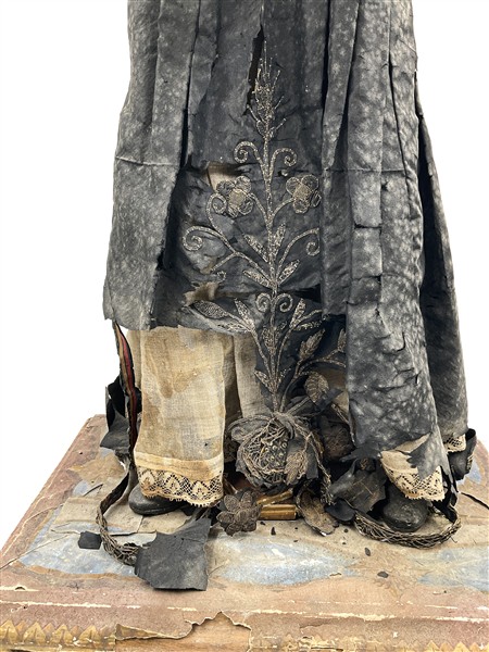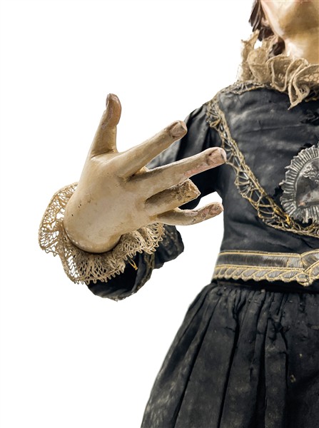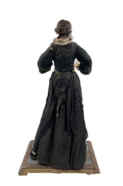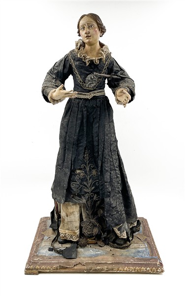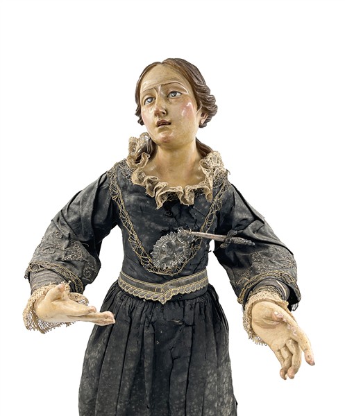 Arte napoletana del secolo XVIII. Figura di santa in legno dipinto, occhi in pasta vitrea, tessuti ed altri materiali (h cm 69) (difetti, mancanze e restauri)