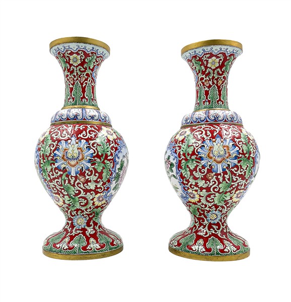 Coppia di vasi in metallo smaltato con decoro floreale policromo. Cina, secolo