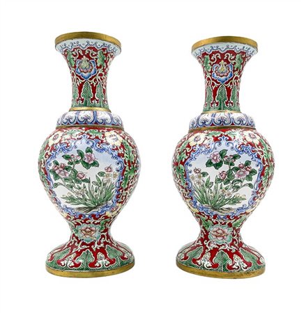 Coppia di vasi in metallo smaltato con decoro floreale policromo. Cina, secolo XX (h. cm 27) (lievi difetti)
