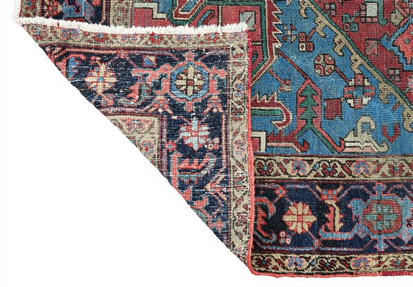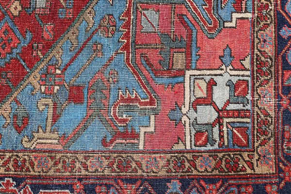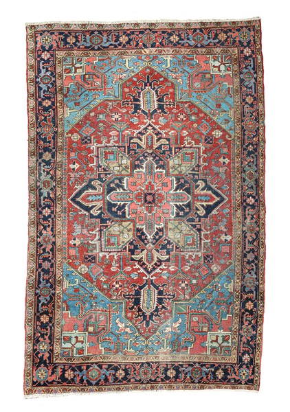 Tappeto Heritz, Persia, fine secolo XIX. Decoro con medaglione polilobato con grandi puntali su campo color rosso scuro cosparso di rami fioriti. Angolari a fondo azzurro e bordura con motivo Herati su fondo blu notte (cm 314x213) (difetti)