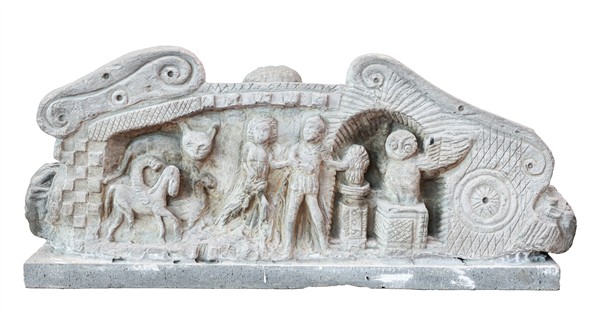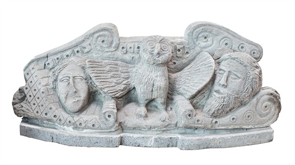 Altorilievo in pietra scolpita su due lati raffiguranti da un lato civetta e volti e dall'altro una scena rituale, iscrizione in greco sulla sommità del fregio (cm 87x35x28) (difetti)