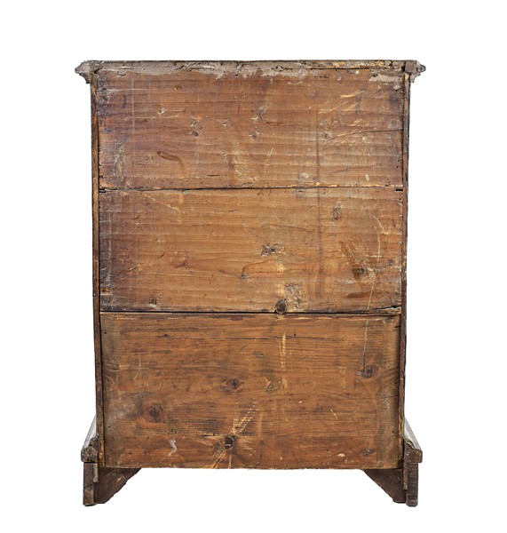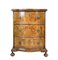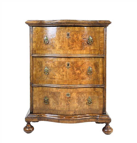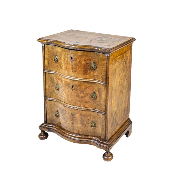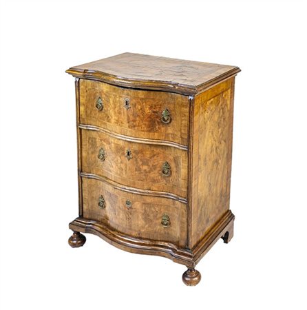Mobiletto lastronato in noce e filettato, fronte mosso a tre cassetti, piedi anteriori a cipolla. Secolo XVIII (cm 67x84x 45) (difetti e restauri)