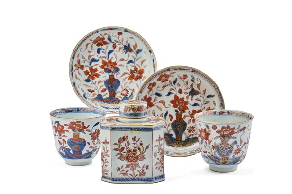 Manifattura del secolo XVIII. Lotto composto da coppia di tazze con piatto e un portatè con coperchio in porcelllana dipinte in policromia a motivo Imari e profili in oro (h. max cm 11) (lievi difetti)