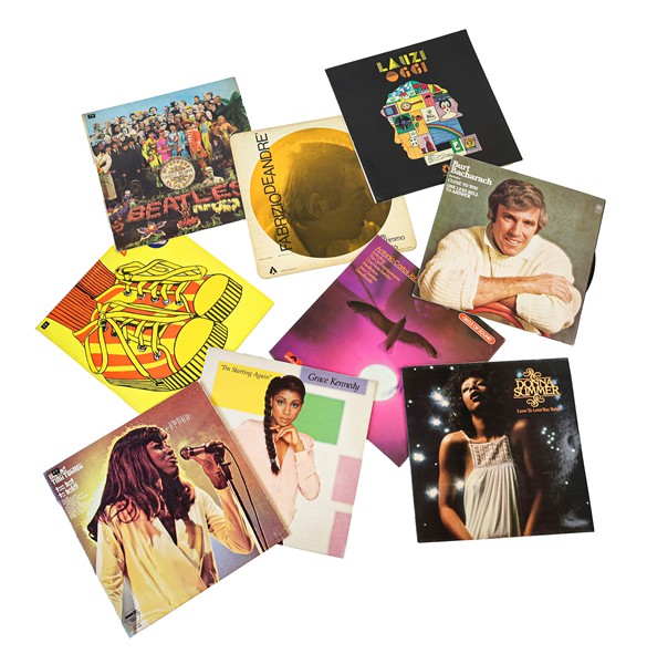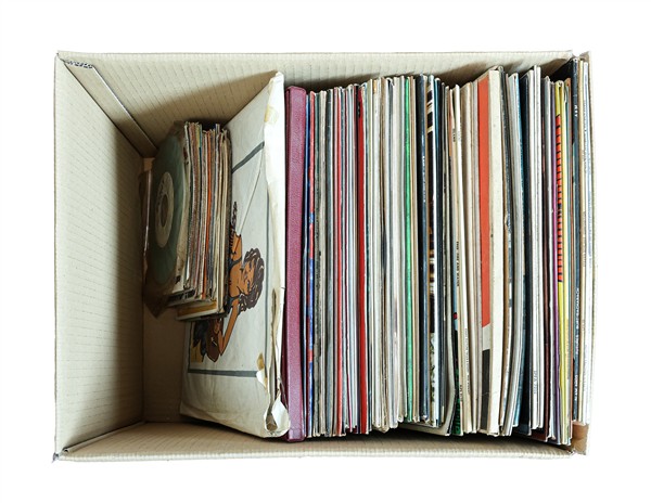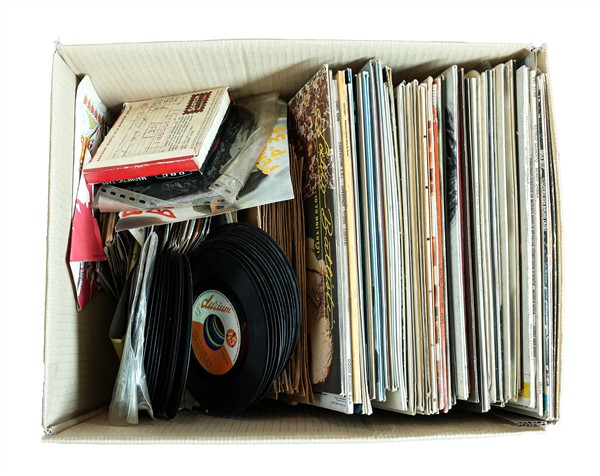Tre cartoni contenenti numerosi dischi 33 e 45 giri, principalmente di musica i