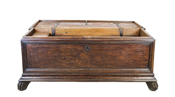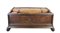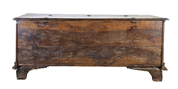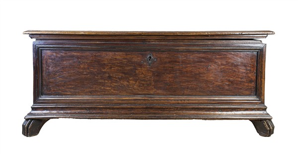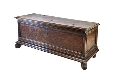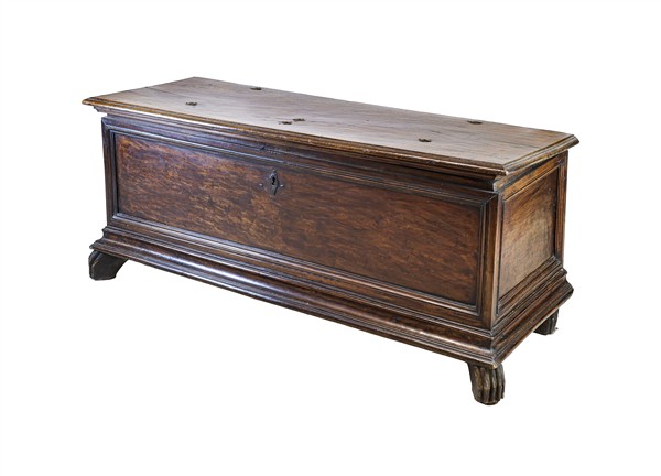 Cassapanca in noce con fronte e fianchi riquadrati, piedi ferini. Secolo XVIII