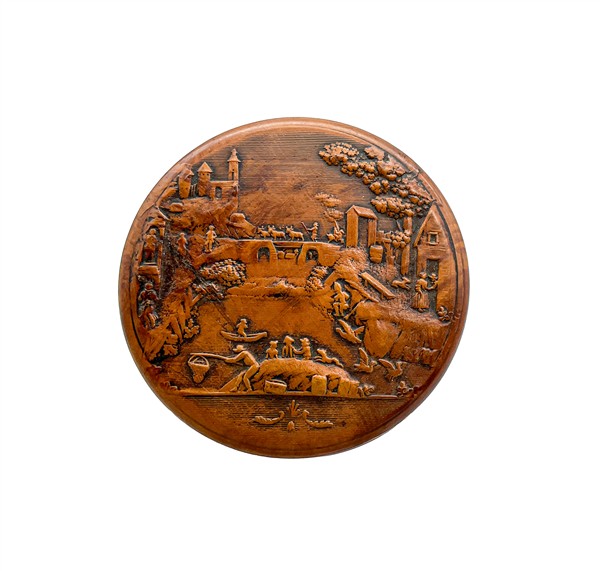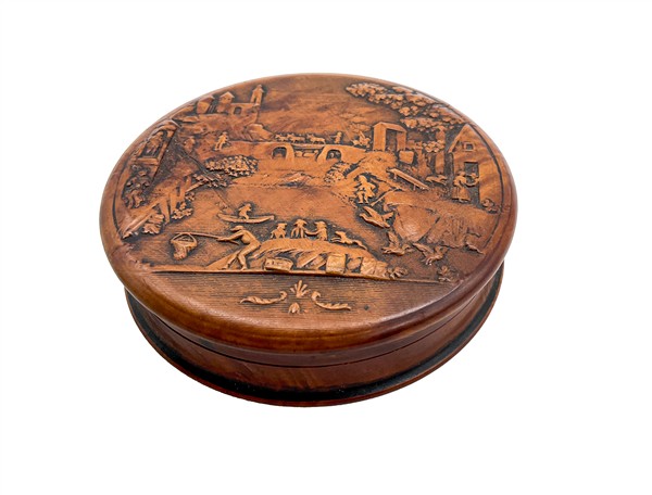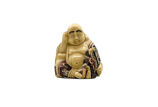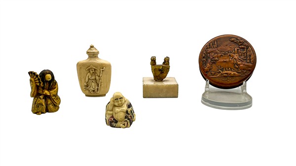 Arte del secolo XIX. Lotto in avorio composto da due okimono, una snuff bottle, un frammento di figura stilizzata su base in marmo uniti ad una tabacchiera in acero pressato ed interno in tartaruga (difetti e rotture)
