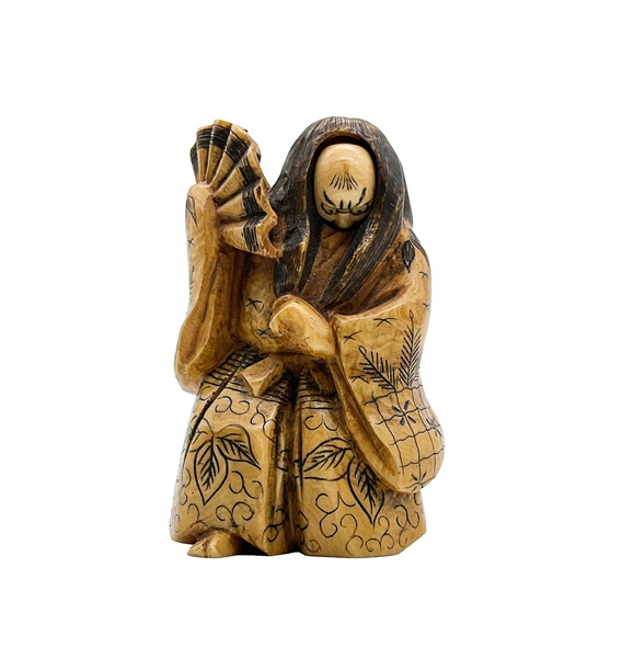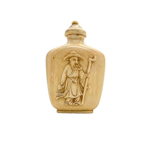 Arte del secolo XIX. Lotto in avorio composto da due okimono, una snuff bottle,