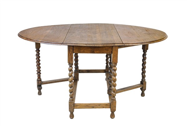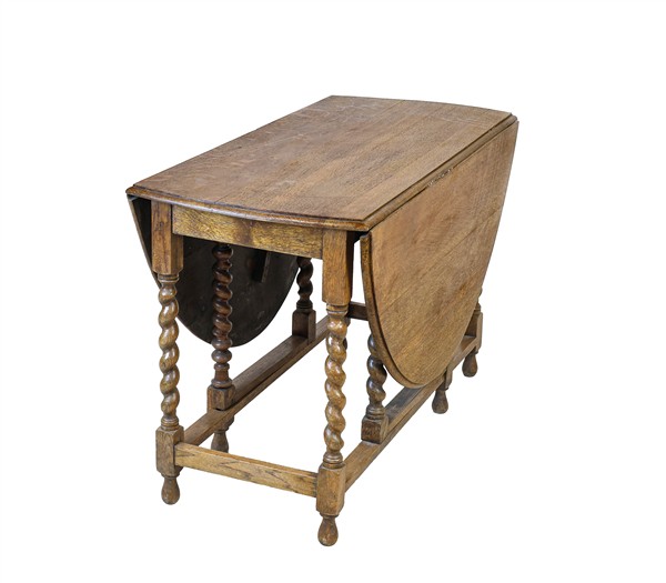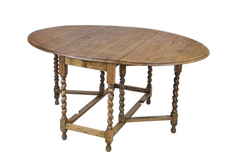 Tavolo ad alette in rovere con gambe a torchon riunite da traversa (chiuso cm 107x72x53) (difetti)
