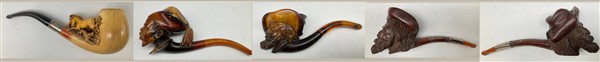 Lotto composto da cinque pipe in schiuma di mare intagliate a teste maschili, e