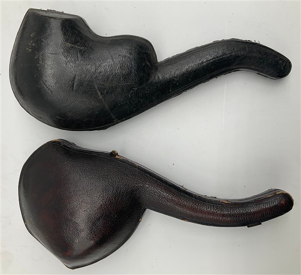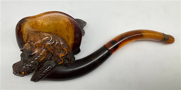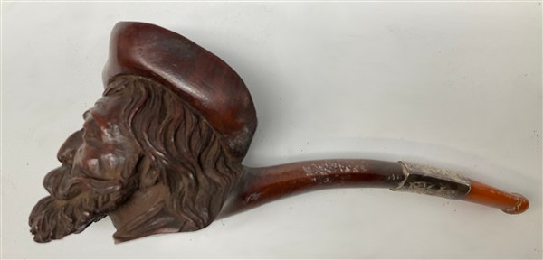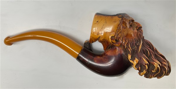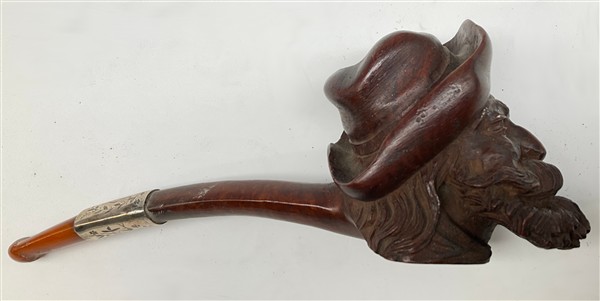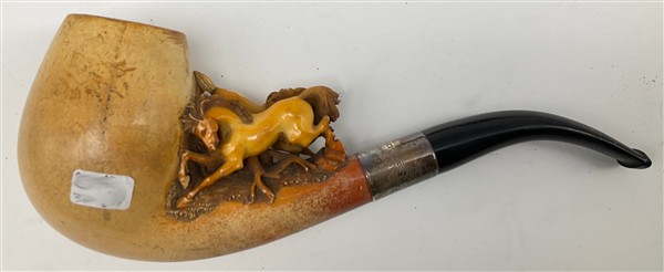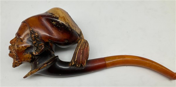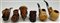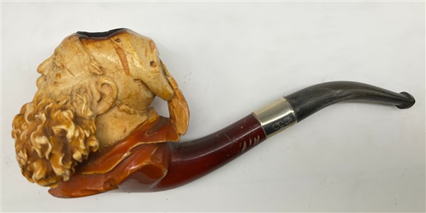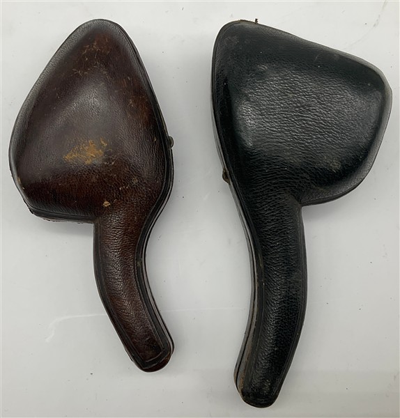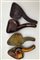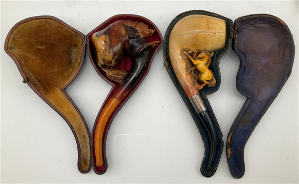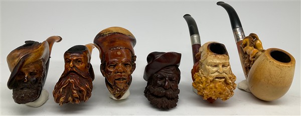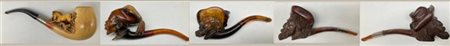 Lotto composto da cinque pipe in schiuma di mare intagliate a teste maschili, ed una con cavalli e cane, delle quali cinque in custodie originali. Secolo XIX (difetti e mancanze)
