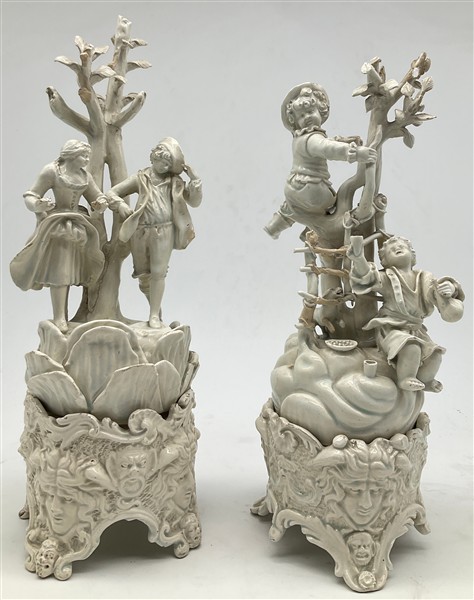 Manifatture venete, secolo XIX. Due gruppi in terraglia smaltata in bianco raffiguranti scena galante e giochi di putti, su basi sagomate con mascheroni adattate (h max cm 41) (difetti, mancanze e restauri)