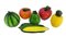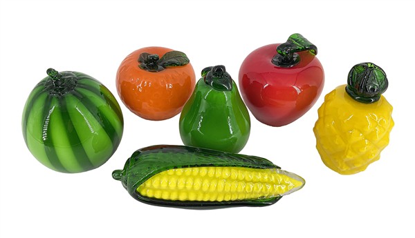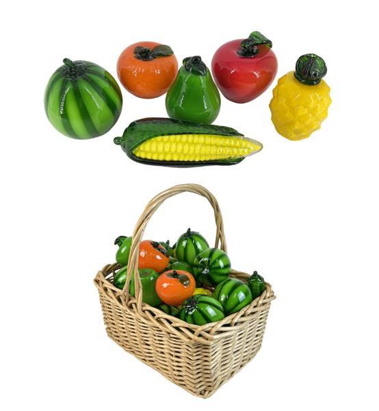 Lotto composto da numerosi frutti in vetro policromo di vari forme, in un cesto