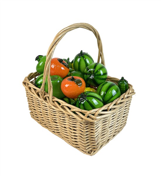 Lotto composto da numerosi frutti in vetro policromo di vari forme, in un cesto (difetti)