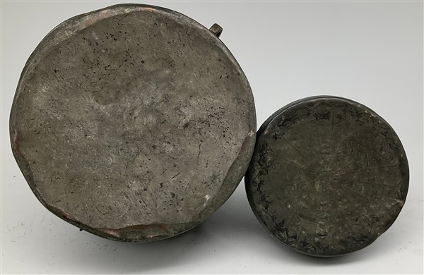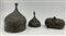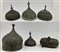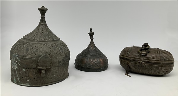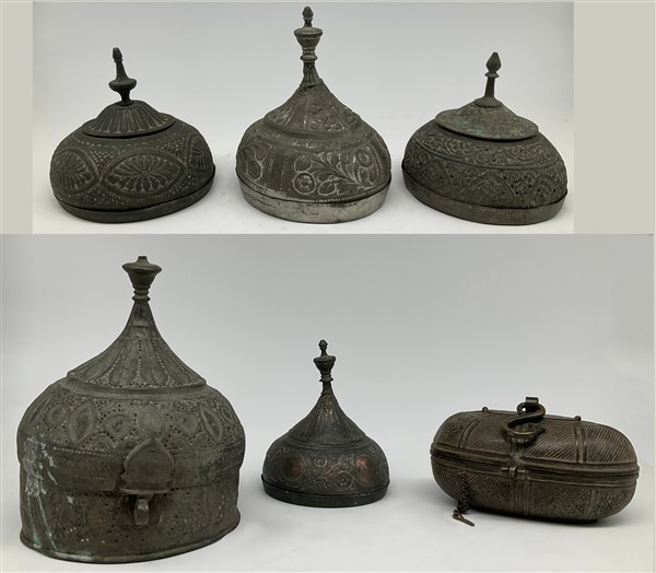 Arte indiana. Lotto di cinque contenitori con coperchi in metalli vari incisi a motivi floreali, uniti ad una scatola ovoidale a guisa di cesta in metallo con gancio (h max cm 23) (difetti e restauri)