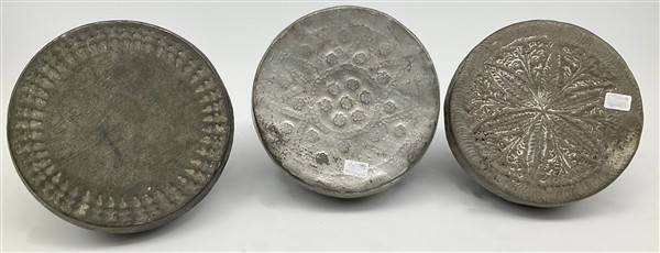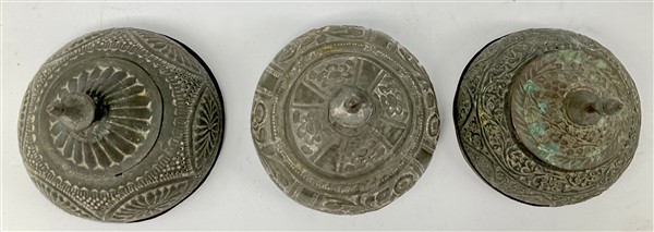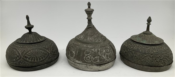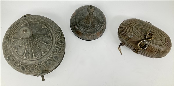 Arte indiana. Lotto di cinque contenitori con coperchi in metalli vari incisi a