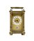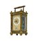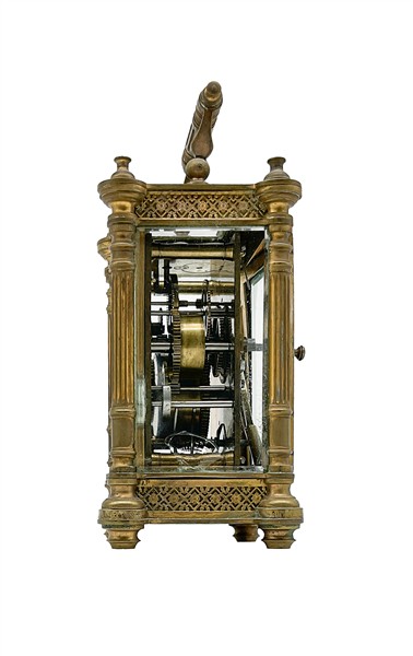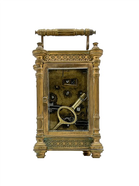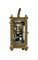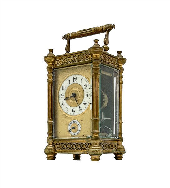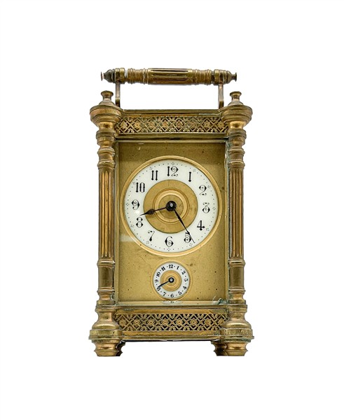 Officier in metallo dorato e vetri. Quadrante a fascia bianca a numeri arabi, movimento solo tempo con sveglia. Fine secolo XIX (h. max cm 16) (difetti)