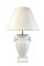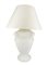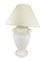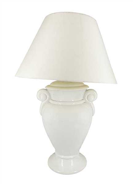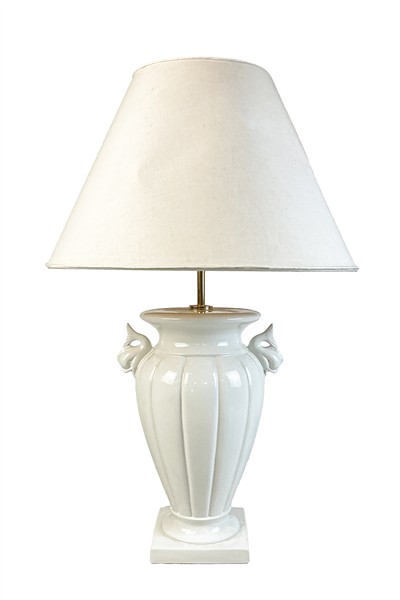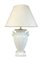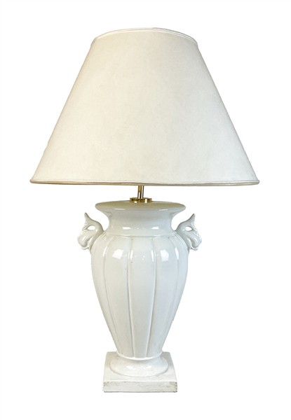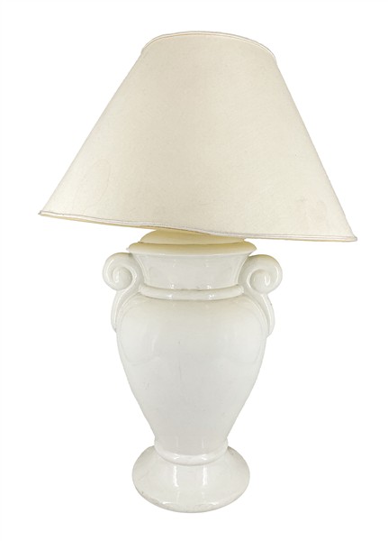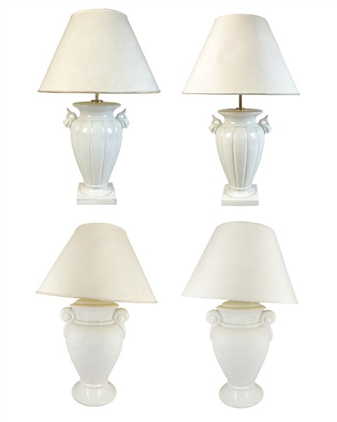 Due coppie di lampade da appoggio con sostegno a vaso biansato in ceramica bianca, con paralumi (h max cm 75) (difetti)