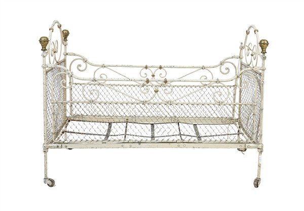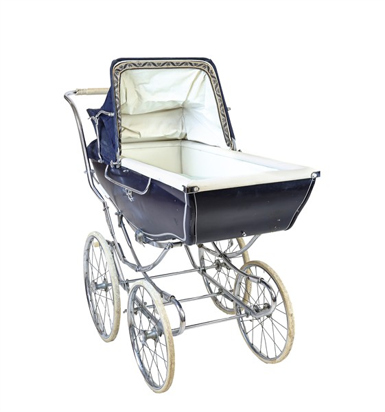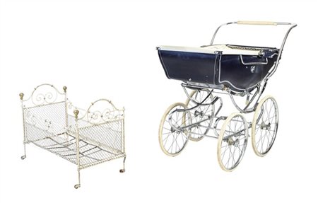 Lotto composto da una carrozzina da passeggio Vintage Silver Cross e un lettino da neonato in ferro ritorto (difetti e mancanze)
