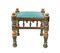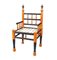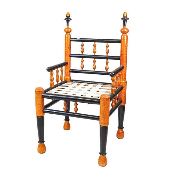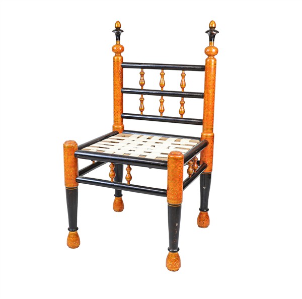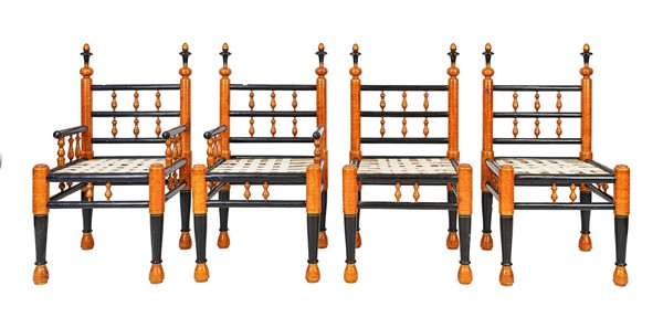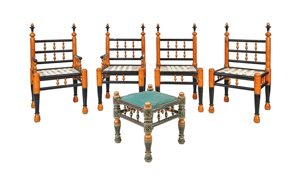 Lotto composto da quattro sedie in legno tornito e dipinto e un panchetto quadrato di simile decoro (difetti e cuscini mancanti)