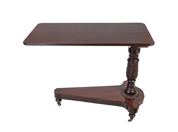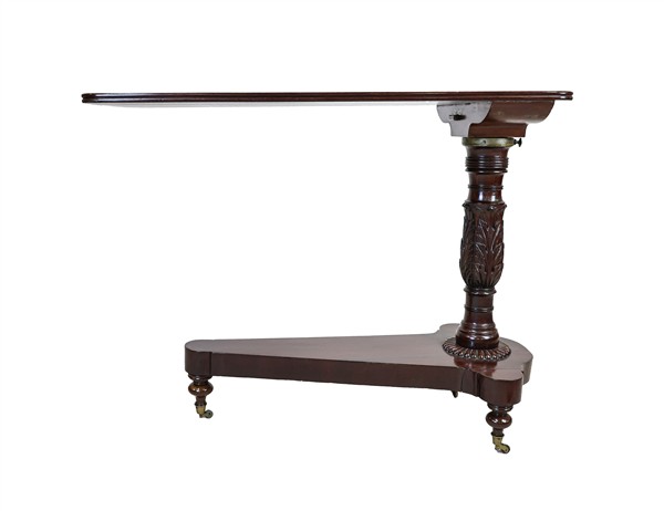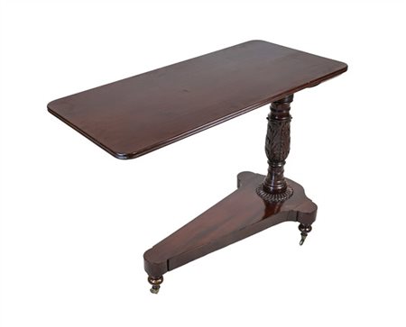 Tavolino servitore in mogano con sostegno intagliato a foglie e base sagomata su ruotine, regolabile in altezza con piano rettangolare. Inghilterra, secolo XIX-XX (cm 104x79x48) (difetti)