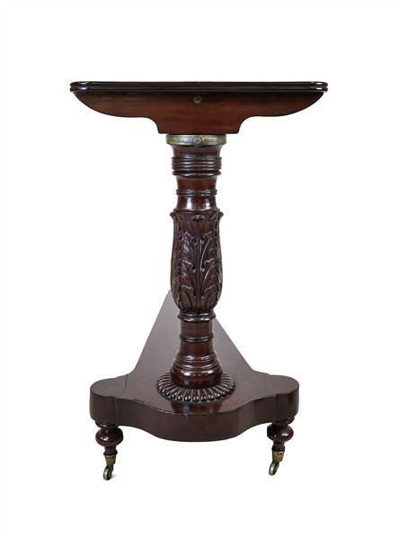 Tavolino servitore in mogano con sostegno intagliato a foglie e base sagomata s