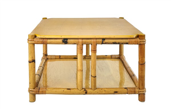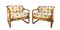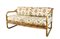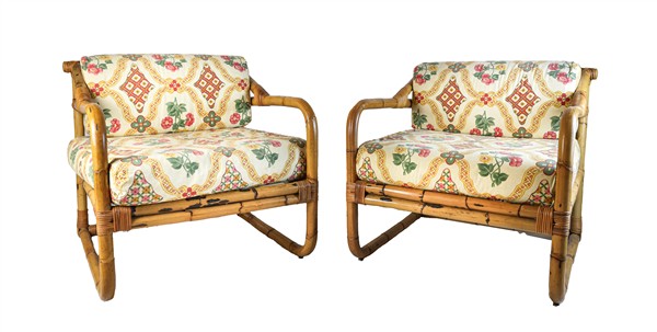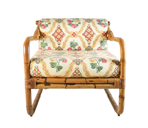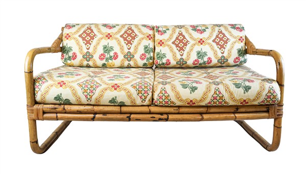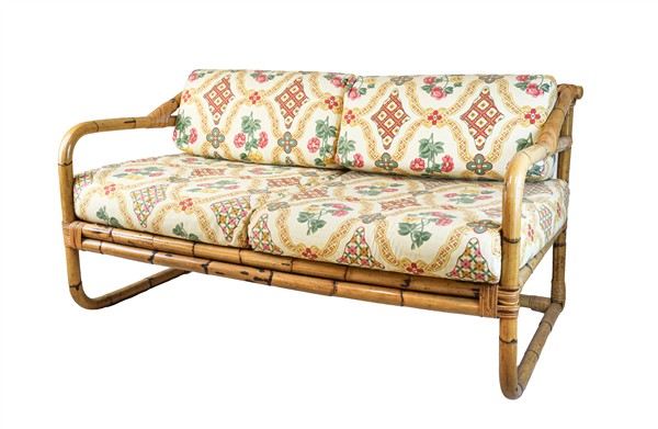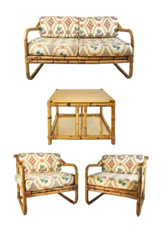 Fornitura da salotto in giunco e scortecciato con cuscini rivestiti in tessuto decorato a fiori e greche. Italia, anni '70. (lievi difetti)