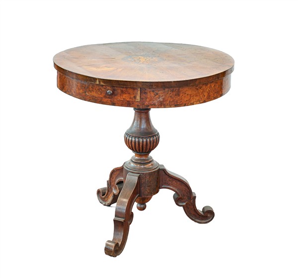 Tavolino con piano circolare in legni vari decorato da intarsio a motivo floreale, un tiretto nella fascia, sostegno baccellato su tripode. Secolo XIX. (d cm 77, h cm 79) (difetti)