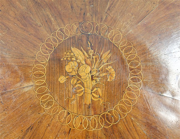 Tavolino con piano circolare in legni vari decorato da intarsio a motivo florea