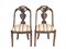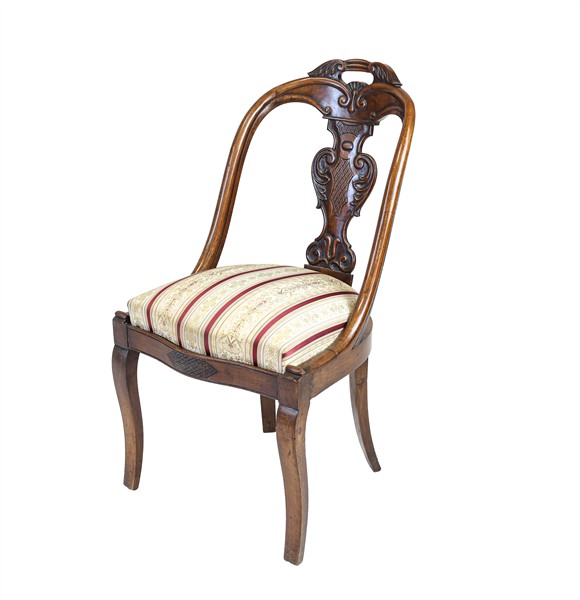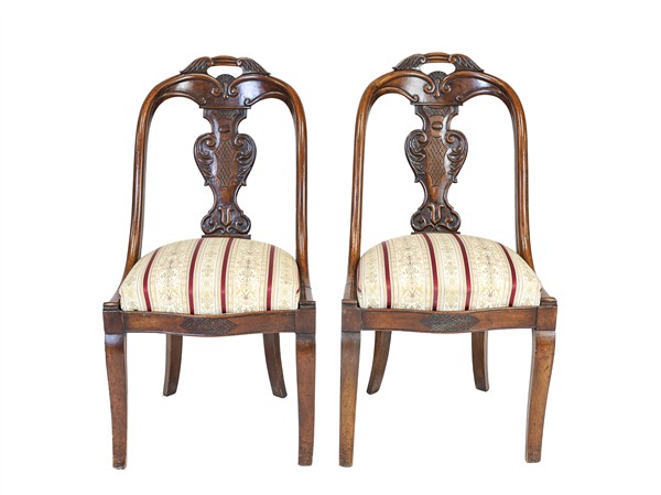 Lotto composto da coppia di sedie a gondola in mogano, due panchetti con gambe
