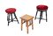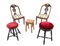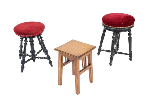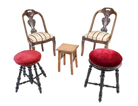 Lotto composto da coppia di sedie a gondola in mogano, due panchetti con gambe tornite ed ebanizzate con sedute rivestine in velluto rosso ed un tavolino (difetti)