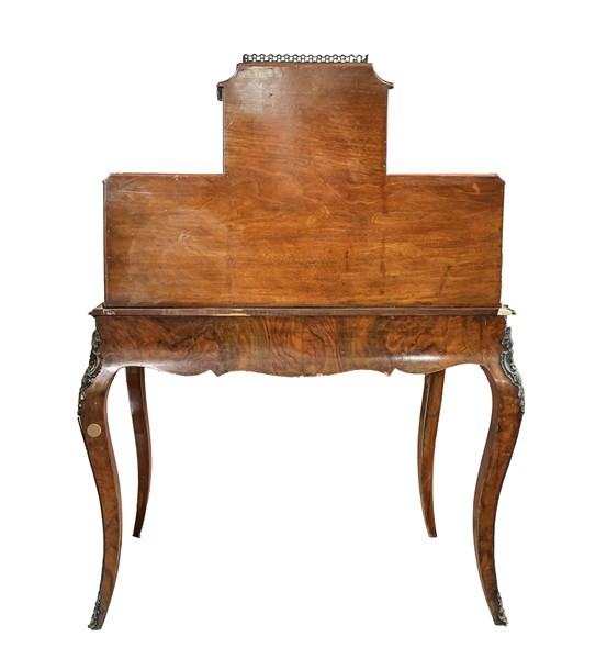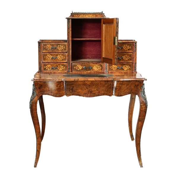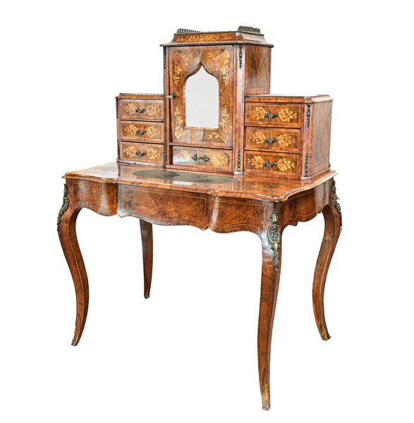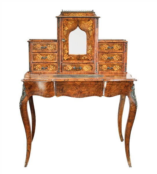 Bonheur du jour impiallacciato e intarsiato in legni vari a motivi floreali, piano sagomato con riserva in pelle e cassetto nella fascia, gambe mosse, parte superiore con sette tiretti e antina specchiata, fregi in metallo (cm 90x127x62) (difetti e piccole mancanze)