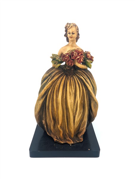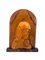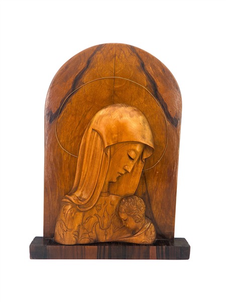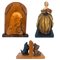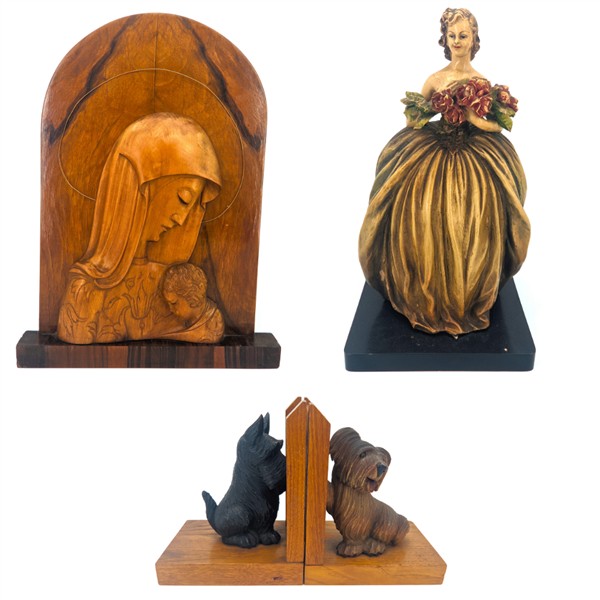 Lotto composto da coppia di fermalibri in legno intagliato a forma di cagnolini, un rilievo ligneo con busto della Vergine con Bambino su pannello centinato e radicato e una figura di dama in terracotta dipinta su base in legno ebanizzato firmata Mollica (h max cm 45) (difetti)