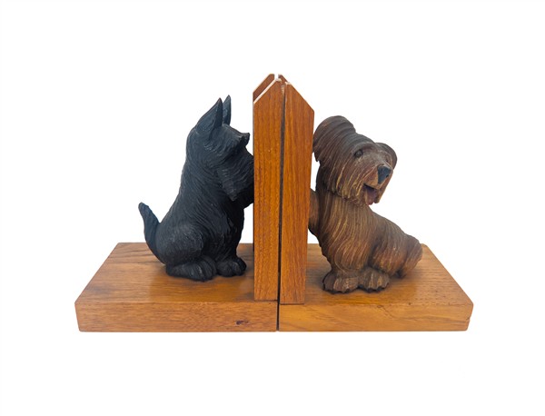 Lotto composto da coppia di fermalibri in legno intagliato a forma di cagnolini