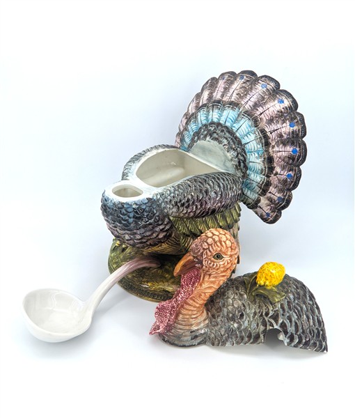 Salsiera in ceramica policroma a forma di tacchino con coperchio e mestolino (h