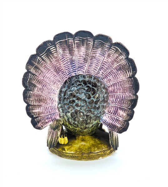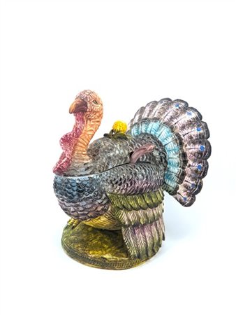 Salsiera in ceramica policroma a forma di tacchino con coperchio e mestolino (h cm 27) (difetti)